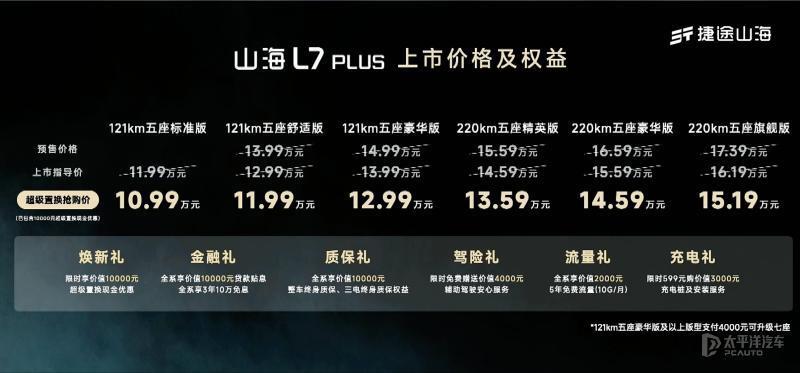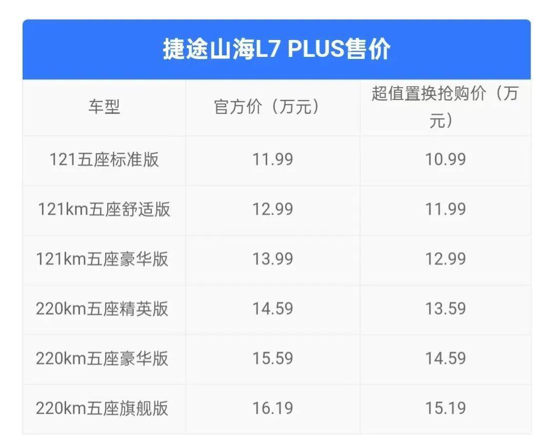 8月26日,捷途山海L7 PLUS正式上市,新车共推出六款产品,售价区间为11.99-16.19万元,超级置换抢购价10.99-15.19万元。。新车主打是一款全电动调节7座的中型SUV,尺寸比捷途山海L7更大,纯电续航里程超200km。